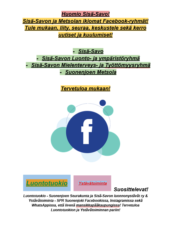 Facebook-ryhmät/groups: Sisä-Savo, Sisä-Savon Mielenterveys- ja Työttömyysryhmä & Sisä-Savon Luonto- ja ympäristöryhmä
