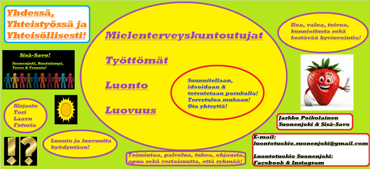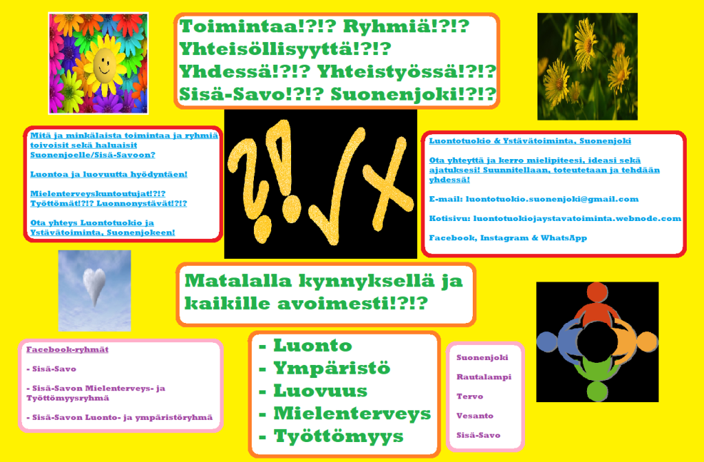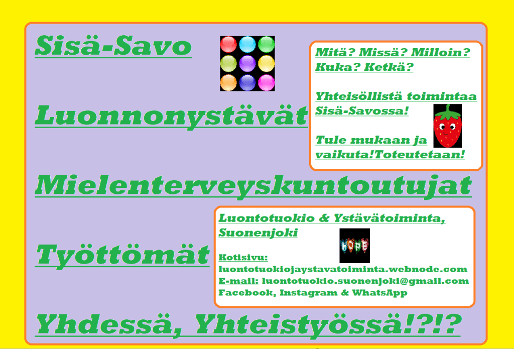 Luontotuokio & Ystävätoiminta, Suonenjoki & Sisä-Savo: luontotuokiojaystavatoimintasuonenjoki.webnode.fi / luontotuokio.suonenjoki@gmail.com + Facebook, Instagram & WhatsApp – Sisä-Savon luonnonystävät: http://www.sll.fi/sisa-savo – Suonenjoen Seurakunta: http://www.suonenjoenseurakunta.fi & SPR Suonenjoki: rednet.punainenristi.fi/suonenjoki