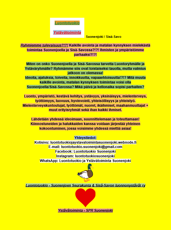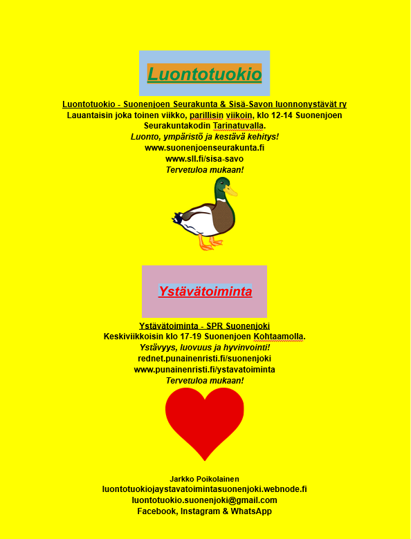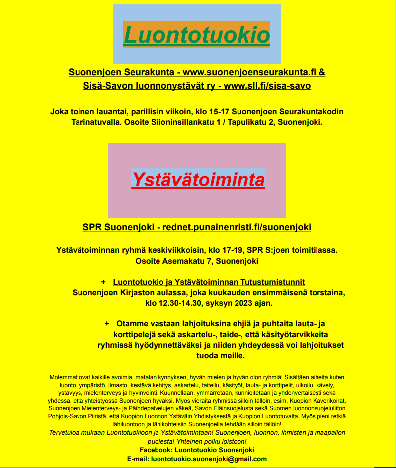 Suonenjoen Seurakunnan & Sisä-Savon luonnonystävät ry:n Luontotuokio (Nature Moment) & SPR Suonenjoen Ystävätoiminta (Friendship Service), Suonenjoki Luontotuokio (Nature Moment) & Ystävätoiminta (Friendship Service), Suonenjoki & Sisä-Savo. Jaa: Jaa X:ssä(Avautuu uudessa ikkunassa) X Jaa Facebookissa(Avautuu uudessa ikkunassa) Facebook Tykkää Lataa...